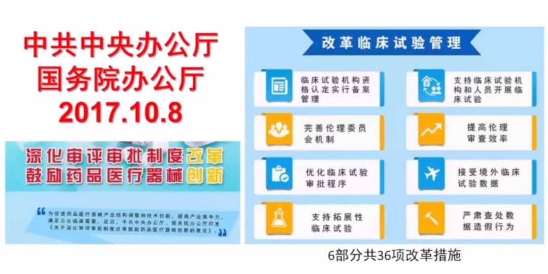 2017年10月8日,為鼓勵(lì)藥品醫(yī)療器械科技創(chuàng)新,提高上市產(chǎn)品質(zhì)量和產(chǎn)業(yè)競(jìng)爭(zhēng)力,滿足公眾臨床需要,中共中央辦公廳、國(guó)務(wù)院辦公廳印發(fā)了《關(guān)于深化審評(píng)審批制度改革鼓勵(lì)藥品醫(yī)療器械創(chuàng)新的意見(jiàn)》。在多方面深化了審批制度,包括改革臨床試驗(yàn)管理、加快上市審評(píng)審批、促進(jìn)藥品創(chuàng)新和仿制藥發(fā)展、加強(qiáng)藥品醫(yī)療器械全生命周期管理、提升技術(shù)支撐能力、加強(qiáng)組織實(shí)施等。