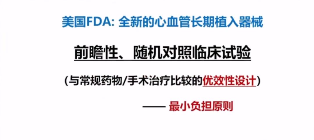 李衛(wèi)教授講到,美國(guó)FDA針對(duì)全新的心血管長(zhǎng)期植入器械,也要做前瞻性、隨機(jī)對(duì)照臨床試驗(yàn)。創(chuàng)新產(chǎn)品無(wú)同類產(chǎn)品可對(duì)照,可與常規(guī)的藥物/手術(shù)治療比較的優(yōu)效性設(shè)計(jì),也就是最小負(fù)擔(dān)原則。