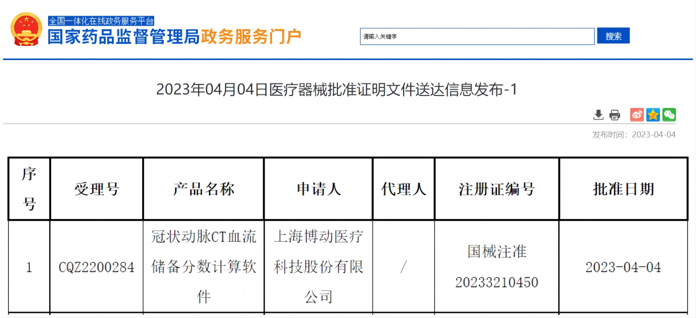 2023年4月4日,經(jīng)國家藥監(jiān)局NMPA公示,上海博動(dòng)醫(yī)療科技股份有限公司的創(chuàng)新醫(yī)療器械“冠狀動(dòng)脈CT血流儲(chǔ)備分?jǐn)?shù)計(jì)算軟件”(國械注準(zhǔn)20233210450)獲得國家藥品監(jiān)督管理局批準(zhǔn)上市,奧泰康承擔(dān)本項(xiàng)目臨床試驗(yàn)服務(wù),系2023年奧泰康助力獲得的第六張三類醫(yī)療器械注冊(cè)證。