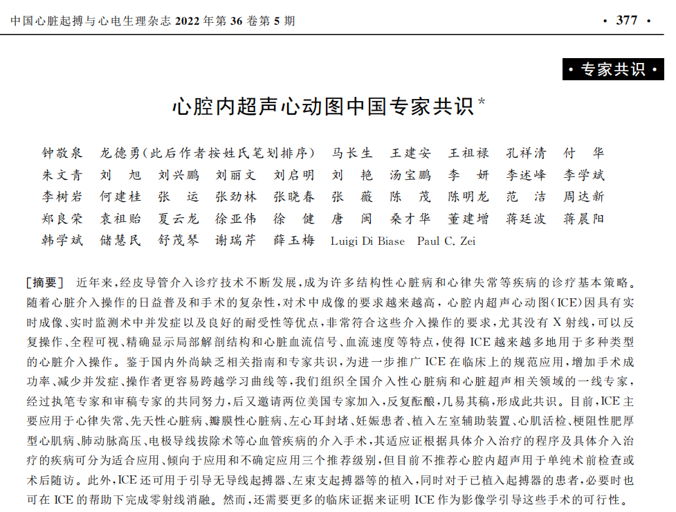 鑒于目前國際上缺乏相關(guān)指南,為促進和規(guī)范ICE的臨床應(yīng)用,為臨床醫(yī)生提供指導,進一步完善心血管介入診斷和治療方案,2022年10月,由國內(nèi)外數(shù)十位頂尖專家學者編寫完成全球首個心腔內(nèi)超聲專家共識,聯(lián)合在Frontiers in Cardiovascular Medicine上發(fā)表,推動了心腔內(nèi)超聲心血管介入領(lǐng)域的的規(guī)范化應(yīng)用。