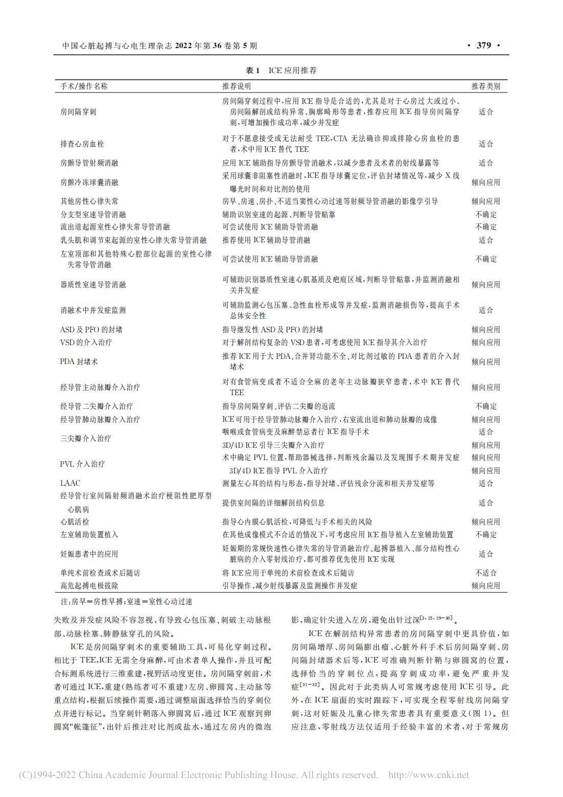 共識指出,ICE最初主要用于指導房間隔缺損(ASD)和卵圓孔未閉(PFO)的介入封堵,其成像效果與經(jīng)食管超聲心動圖(TEE)相當,ICE可對房間隔進行成像,明確卵圓窩的位置和解剖結(jié)構(gòu),輔助術(shù)者選擇理想穿刺位置,提高房間隔穿刺的成功率和安全性,現(xiàn)已應(yīng)用于多種需要房間隔穿刺的介入手術(shù),如心房顫動射頻導管消融術(shù)、二尖瓣介入治療手術(shù)、左心耳封堵術(shù)(LAAC)等。并且,ICE可顯示食管、動脈和心耳等結(jié)構(gòu),從而有望避免相關(guān)并發(fā)癥的發(fā)生,增加術(shù)者信心,減少學習曲線,減少并發(fā)癥,增加成功率。