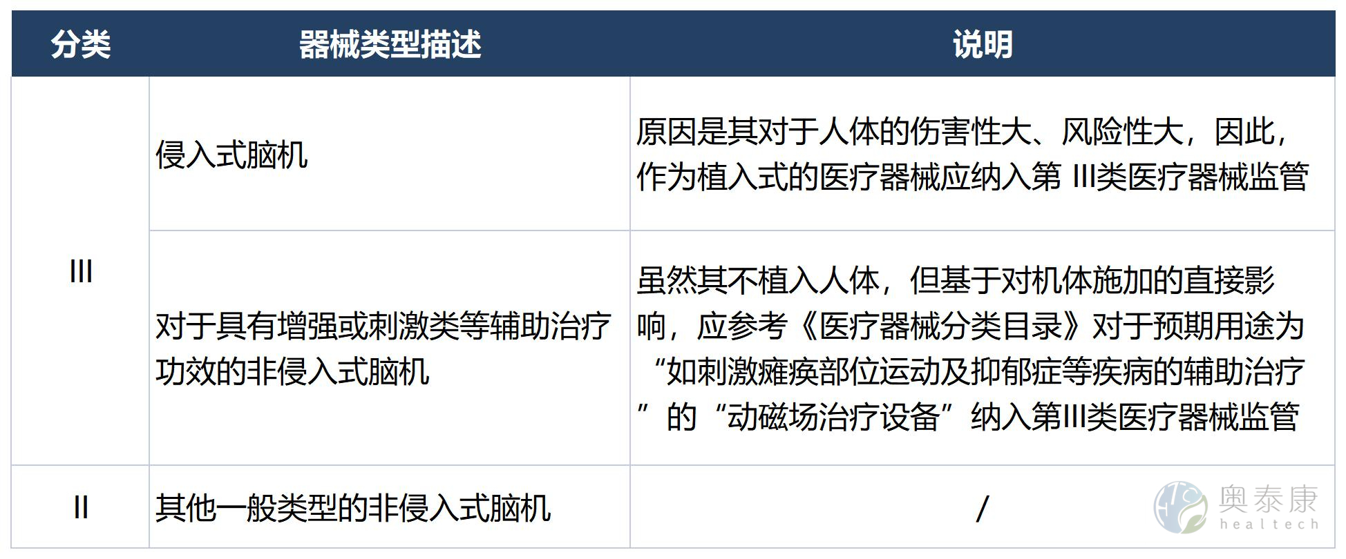 腦機接口技術需要大規(guī)模的臨床試驗和更加嚴謹?shù)囊?guī)范來推動其順利落地應用,依據(jù)影響醫(yī)療器械風險程度的因素、風險程度高低兩類判斷標準,目前,腦機接口臨床試驗規(guī)范還需要更加完善和細化,例如腦機接口臨床準入細則、數(shù)據(jù)采集、處理、分析以及治療效果評估等等方面的指導,以確保在腦機接口產(chǎn)品的開發(fā)和推廣過程中不會出現(xiàn)安全隱患。《醫(yī)療器械分類目錄》規(guī)定腦機接口設備的分類監(jiān)管要求如下: