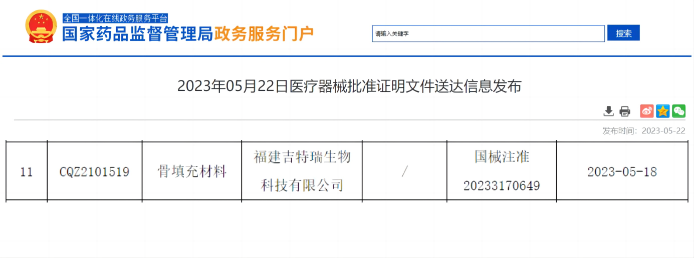 2023年5月18日,經(jīng)國家藥品監(jiān)督管理局公示,福建吉特瑞生物科技有限公司的“骨填充材料”(國械注準20233170649)獲得NMPA批準上市,奧泰康承擔本產品臨床試驗服務,系本年度奧泰康合作項目獲得的第9張三類醫(yī)療器械注冊證。