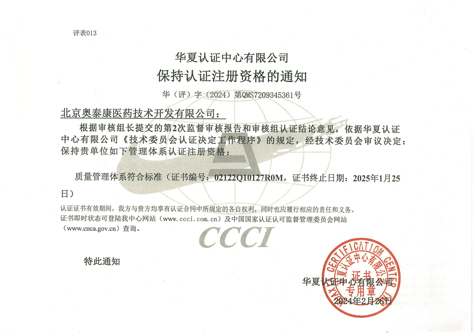 認證審核組采用現(xiàn)場核查、調(diào)看材料、談話、提問等多種方式對公司體系的策劃、質(zhì)量方針目標(biāo)及完成情況、資源配置的有效性、管理體系運行的符合性等進行了審核。經(jīng)審核,我司各類管理文件均達到國家ISO9001質(zhì)量管理體系規(guī)定標(biāo)準(zhǔn),最終獲得審核組專家“滿足審核準(zhǔn)則要求且運行有效,現(xiàn)場審核通過”的一致評價,一致認為北京奧泰康醫(yī)藥技術(shù)開發(fā)有限公司質(zhì)量管理體系符合GB/T19001/2016/ISO 9001:2015準(zhǔn)則和應(yīng)用要求,質(zhì)量體系運行持續(xù)有效。
