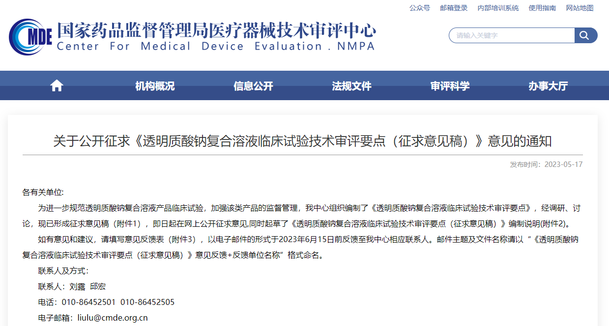 ▲ 《透明質(zhì)酸鈉復(fù)合溶液臨床試驗(yàn)技術(shù)審評(píng)要點(diǎn)(征求意見(jiàn)稿)》 (來(lái)源:器審中心)