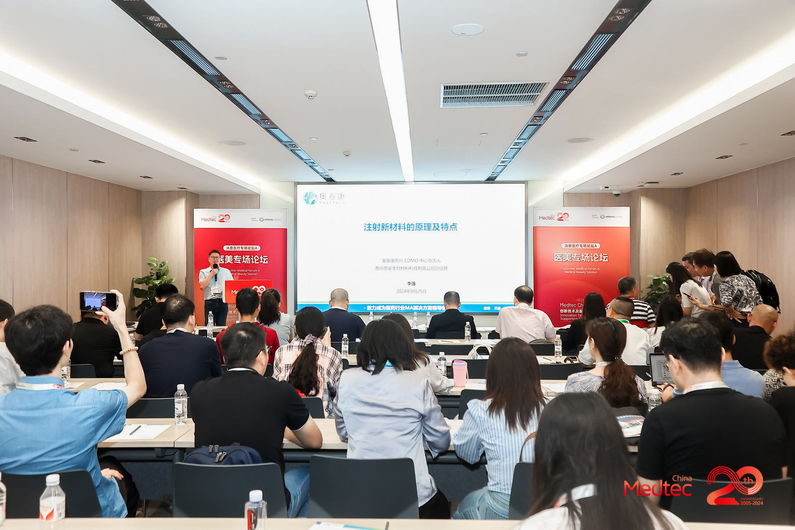 今年新增的消費(fèi)醫(yī)療專場論壇備受矚目,醫(yī)美專場論壇現(xiàn)場座無虛席。奧泰康蘇州CDMO中心負(fù)責(zé)人李強(qiáng)為與會(huì)者帶來了一場關(guān)于《注射新材料的原理及特點(diǎn)》的深度解析與前瞻分享,贏得參會(huì)者關(guān)注與認(rèn)可。他在分享中圍繞“注射類產(chǎn)品概況、注射新材料作用理及特點(diǎn)、絲素蛋白材料簡介”等方面對注射類材料進(jìn)行闡述,他強(qiáng)調(diào),注射新材料不僅要在生物相容性、機(jī)械強(qiáng)度、降解速率等方面滿足醫(yī)療器械的嚴(yán)格要求,還要具備易于加工、成本可控等實(shí)際應(yīng)用優(yōu)勢。在此基礎(chǔ)上,他詳細(xì)介紹了奧泰康CDMO中心在再生醫(yī)學(xué)生物材料及注射新材料領(lǐng)域所取得的突破性成果,包括新型生物材料的研發(fā)、材料改性技術(shù)的創(chuàng)新等,這些成果為注射類產(chǎn)品的性能提升和臨床應(yīng)用提供了有力支撐。