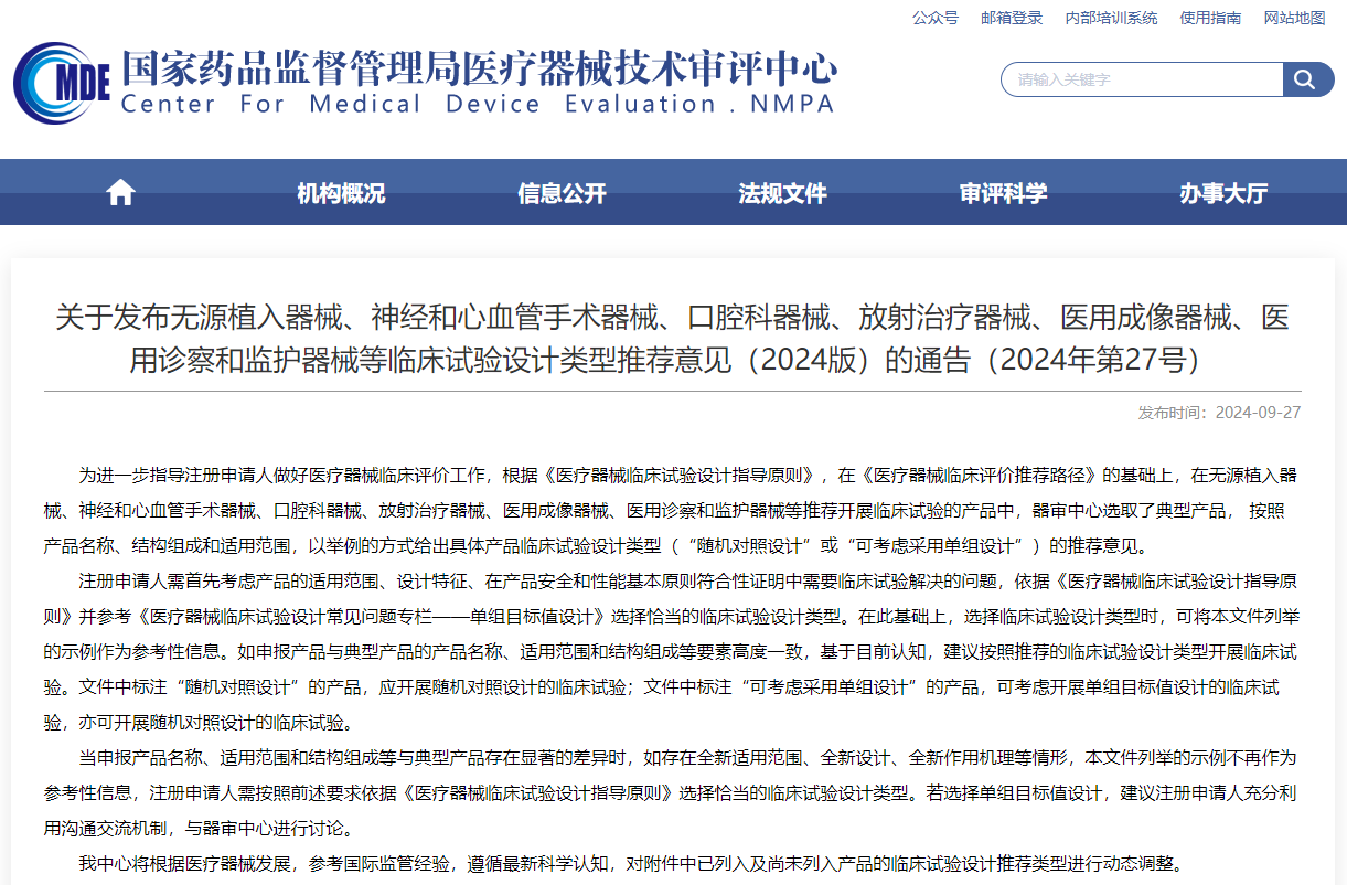 無(wú)源植入器械、神經(jīng)和心血管手術(shù)器械、口腔科器械、放射治療器械、醫(yī)用成像器械、醫(yī)用診察和監(jiān)護(hù)器械等臨床試驗(yàn)設(shè)計(jì)類型推薦意見(jiàn)近日,器審中心發(fā)布《無(wú)源植入器械、神經(jīng)和心血管手術(shù)器械、口腔科器械、放射治療器械、醫(yī)用成像器械、醫(yī)用診察和監(jiān)護(hù)器械等臨床試驗(yàn)設(shè)計(jì)類型推薦意見(jiàn)(2024版)的通告》。