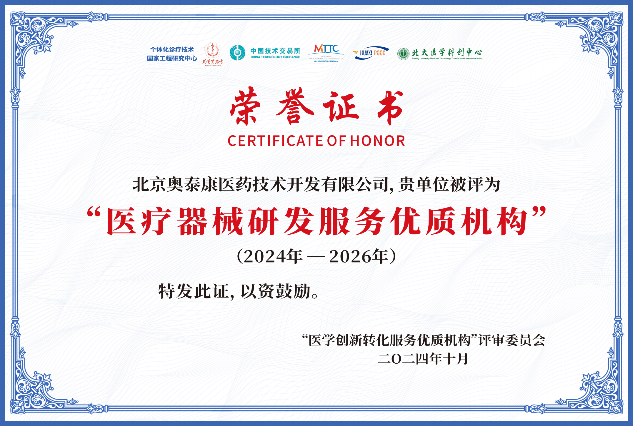 北京奧泰康醫(yī)藥技術(shù)開發(fā)有限公司被評為“醫(yī)療器械研發(fā)服務(wù)優(yōu)質(zhì)機構(gòu)”,集團副總閆江薇女士出席會議并參加榜單發(fā)布儀式。