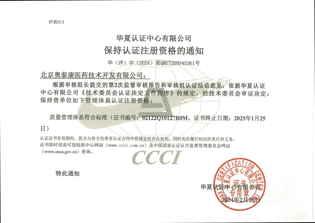 2024年3月,北京奧泰康醫(yī)藥技術(shù)開發(fā)有限公司經(jīng)華夏認證中心有限公司(CCCI)認證,順利通過ISO9001:2015 標(biāo)準(zhǔn)質(zhì)量管理體系認證年度審核,認證范圍為醫(yī)療器械臨床試驗及產(chǎn)品注冊服務(wù)。嚴格的質(zhì)量管理體系是企業(yè)持續(xù)、穩(wěn)定、健康發(fā)展的根本保證,通過ISO9001認證標(biāo)志著我司的醫(yī)療器械臨床試驗及產(chǎn)品注冊服務(wù)與管理體系已達到了國際標(biāo)準(zhǔn)、行業(yè)標(biāo)準(zhǔn),在制度化、體系化和標(biāo)準(zhǔn)化方面取得了里程碑式的進展。