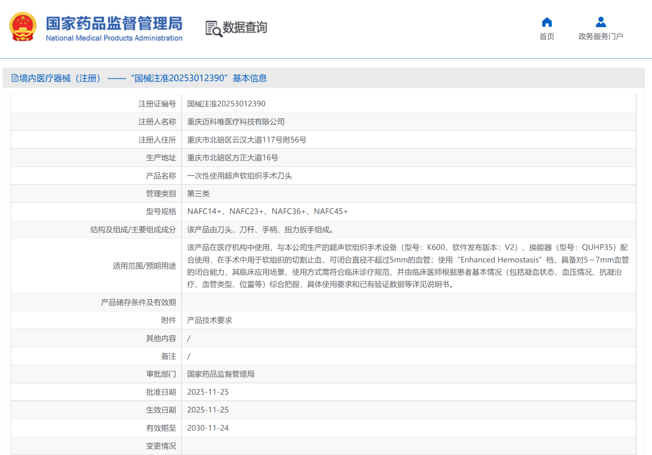 MA成果[慶祝]奧泰康助力邁科唯「一次性使用超聲軟組織手術(shù)刀頭」獲批上市[煙花]系本年度助力獲得的第14張三類注冊(cè)證??2025年11月,經(jīng)國家藥品監(jiān)督管理局公示,重慶邁科唯醫(yī)療科技有限公司研發(fā)的一次性使用超聲軟組織手術(shù)刀頭(國械注準(zhǔn)20253012390)獲得NMPA批準(zhǔn)上市,奧泰康提供市場(chǎng)準(zhǔn)入MA解決方案。
